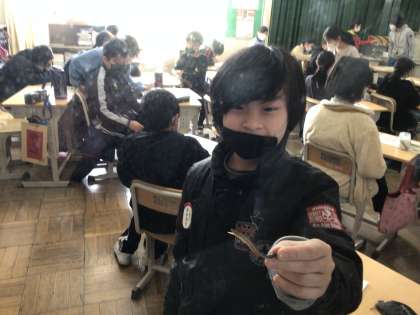 2月16日(木)、5年4組では家庭科の授業で、煮干しの解剖を行いました。