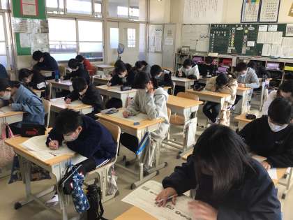 6年生にとって最後の月例テストを行いました。最後というだけあり、各担当が力を入れて作成したようです。範囲が広く苦戦するところもありそうですが、今まで学んだことを思い出しながら一生懸命解いています。近日中に返却されると思いますので、是非ご家庭でご確認ください。