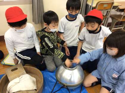 郷土資料館から昔の道具を借りて、実際に触ったり見たりしました。普段当たり前のように使っている物との違いに驚いていました。