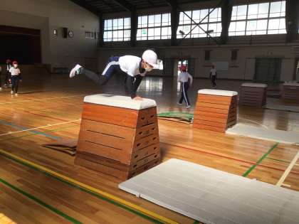 5年生は、体育館で行う体育で器械運動を行っています。
