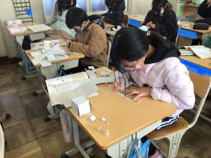 それぞれの立体の特徴について考えた後、見取り図と展開図を描きました。