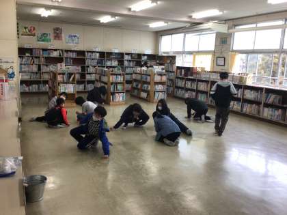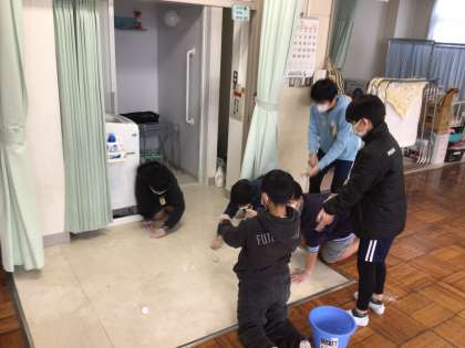 感謝の活動2回目が行われました。ワックスグループは大蜘蛛先生指揮のもと、特別教室のワックス掛けを行っています。今まで使ってきた特別教室での出来事を思い出しながら真剣に作業しています。