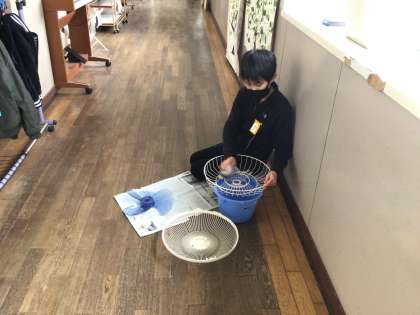 感謝の活動清掃グループでは、陽人先生の指揮のもと、校舎の清掃活動を行なっています。全教室の扇風機やルーバーなど、普段掃除できないものを綺麗にしています。6年生が今までの感謝の気持ちで行っていますが、それぞれの教室の先生に感謝される場面が見られました。