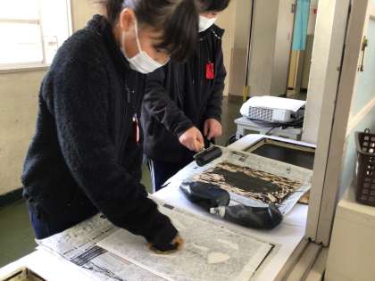 3月6日(月)の1.2限、5年2組では、彫刻刀で掘り終わった子から、版画を刷りました。