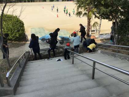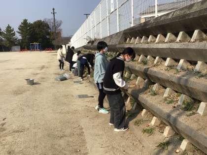 側溝掃除やチューリップの球根植え、体育倉庫掃除、雑巾づくり、白衣の繕いなどを行いました。