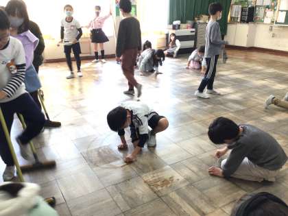年度末のワックスがけのために、机や椅子などを廊下に出して、床の汚れを落としました。1年間お世話になった教室に感謝の気持ちをこめて、時間いっぱいみがいていました。