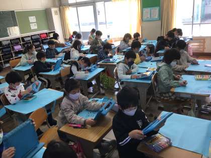 あと少しで3年生です。2年生の学習内容も終わり、復習や進級に向けて準備をしています。上の写真は九九の復習をしているところです。2年生のうちに完璧に覚えられるよう何度も学習をしています。下の写真は今までの作品を持ち帰るバックを作っているところです。1年生の時より、上手に描けたかな?