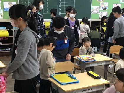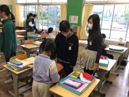 一年生に寄り添い、朝の支度の手伝いを丁寧に行っていました。