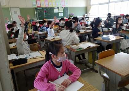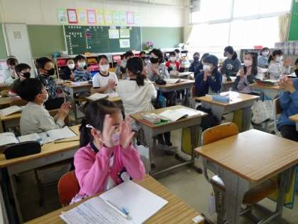 5年生は、早口言葉で活舌トレーニングをしたり、言葉の言い方で伝わり方が変わることを実感したりする勉強中でした。そして、自然に拍手が起こりました。