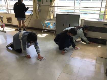 教室掃除では、ほうきの子が掃いた後を雑巾の子が順に拭いていくカルガモ清掃を頑張っていました。