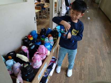 水筒を置くときも、ひもがひっかからないようにきちんと巻いてから置くことができます。