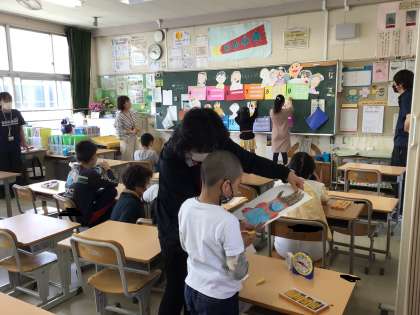 画用紙に絵を描き、まわりをはさみで切りました。 教室後ろの黒板の上部に掲示します。
