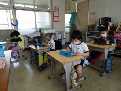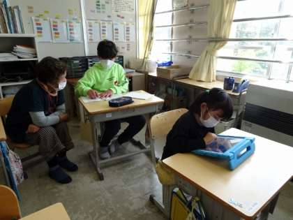なかよしのクラスで、タブレットを使って勉強をしていました。