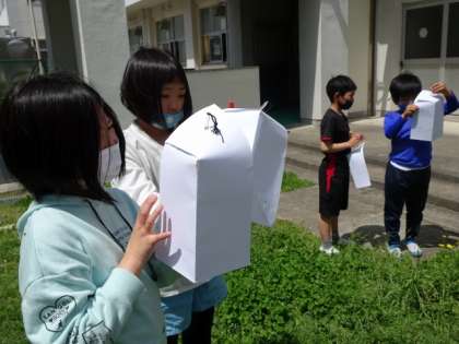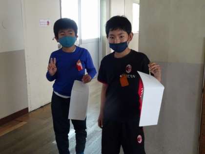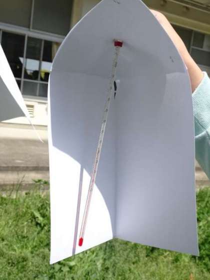 廊下で、何かをしに出掛けていく子どもと会いました。ついていくと、中庭で気温を測るそうでするそうです。理科の学習ですね。