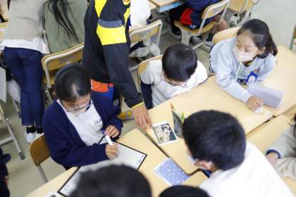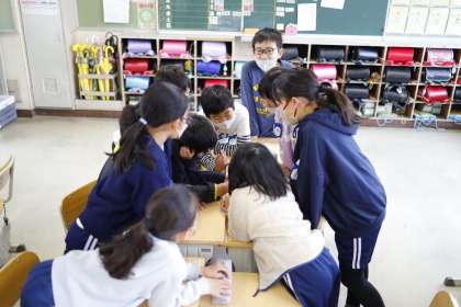 5年1組の最初の図工では、芸術作品のカードを使い、タイトルあてクイズを行いました。絵にどんなことが描かれているかをヒントにして、タイトルを予想しポイント競い合いました。どのグループも象や猫、海など、作品の中心を捉え、ニアピンな解答がたくさんありました。子どもたちが、これからどんな作品をつくっていくのか楽しみです。