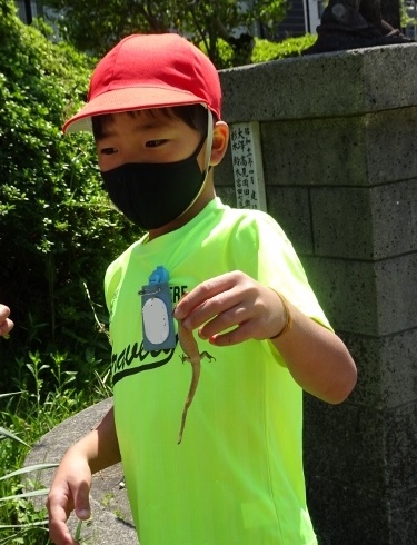 今は、トカゲを捕まえたようです。