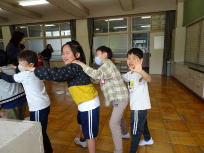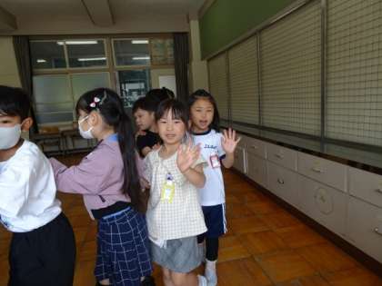 長い列車です。途中で、切れないように気をつけながらタッチをしたり、手を振ってくれる子たちがいました。子どもたちの笑顔がうれしいです。