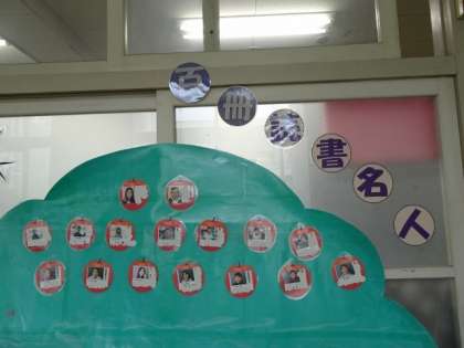図書室前の掲示には、昨年度100冊以上本を読んだ子が紹介されています。