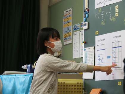 算数「分数×分数」の授業だったのですが、面積図を使って考え方を説明したり、挙手を進んで行ったりする姿が素晴らしく、全校の先生よりお褒めの言葉をいただきました。