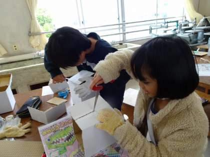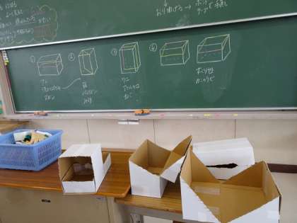 先生の見本も見ながら、どのように箱を切り開くか考えていました。