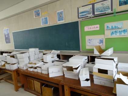 出来上がった箱が図工室の後ろに集められました。箱にとってみれば、次の図工の時間に飾り付けられるのを楽しみに待っているはず。