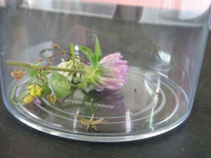 4年生が、逢妻女川に探検に出かけました。その探検でつかまえたバッタを見せてくれました。