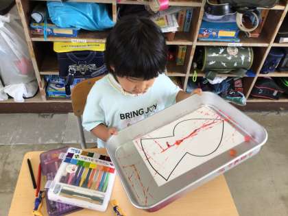 ビー玉に絵の具をつけて画用紙の上で転がすと、 素敵な模様ができました。