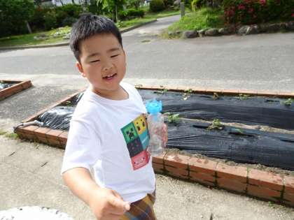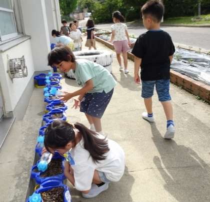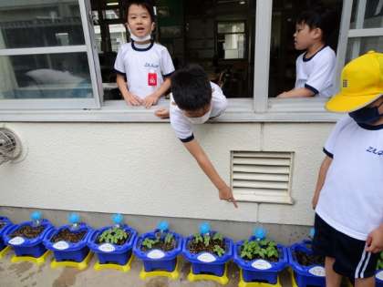 1年生の発達段階では、「自分の」あさがおであることが大事なのです。一人一鉢で育てて、大切にしています。