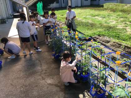 毎日お水をあげながら、野菜のお世話を頑張っています。葉や茎が大きくなり、花を咲かせたり実をつけたりする野菜も増えてきました。収穫が楽しみです。