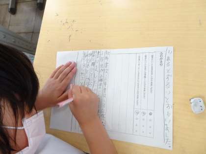 1組の子たちは、書くことがとても上手でした。聞いたことをメモしたり、思ったことをプリントの裏にまでしっかり書いたりする子がいました。授業が終わった後は、この手です。えんぴつでこすれたのでしょう。頑張った証拠ですよ。
