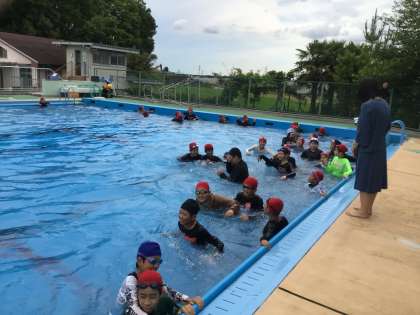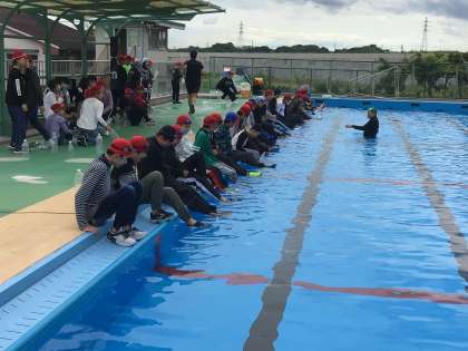 まずはじめに、プールへの正しい入り方をやり、その後に、人間洗濯機でプールに渦を作って楽しみました。