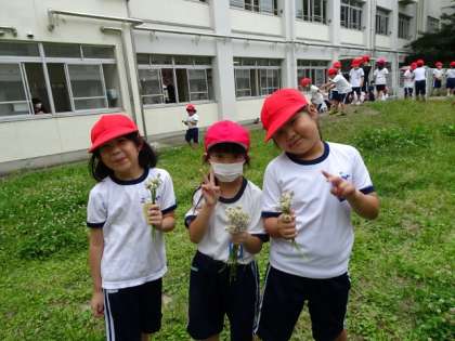 中庭には1年生がいました。草木で思い思いに遊びを見つける子ども達でした。