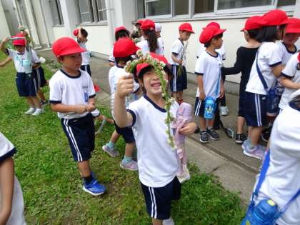 オオバコで引っ張り合いの勝負をしようと1年生の子から挑戦を受けました。