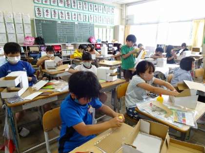 2組の図工の時間です。先日、箱を切り開いたところまで見たのですが、今日は、中身や飾りをつけていました。