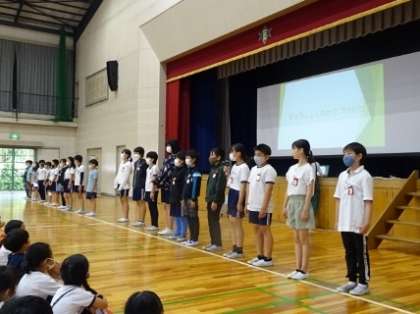 ランチタイム委員会が、給食の配膳や片づけなどについてクイズを交えながら紹介していました。