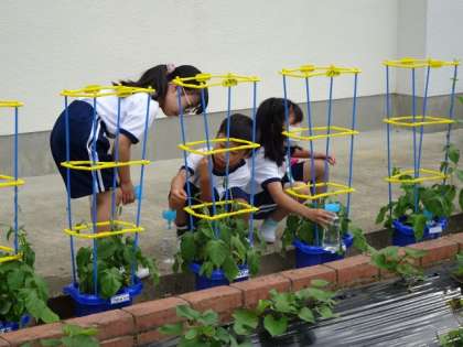 登校後、1年生は朝顔に水をあげていました。