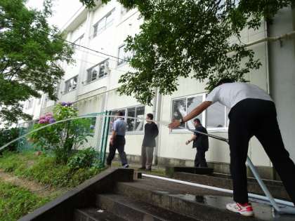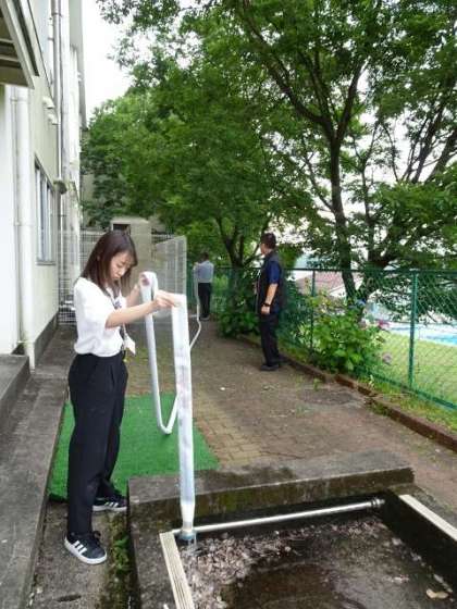 この写真の水圧は、すでに弱くしたものですが、全開にすると3階の校舎まで十分届く水量でした。