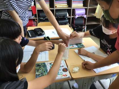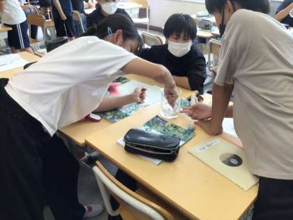 「でんぷんは唾液と混ざるとどうなるのか」について実験をしました。唾液と混ざったご飯(でんぷんが含まれている)は、ヨウ素液をかけると青紫色ではなくなることから、消化液のはたらきで養分が体に吸収されたことが分かりました。