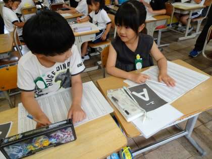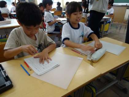 国語で「絵を見て言葉で伝える」学習をしています。お題の絵を、正しく友達に書いてもらうように、説明の仕方を考えています。