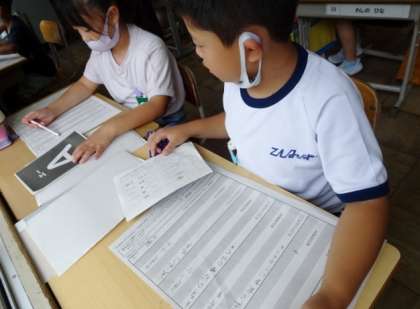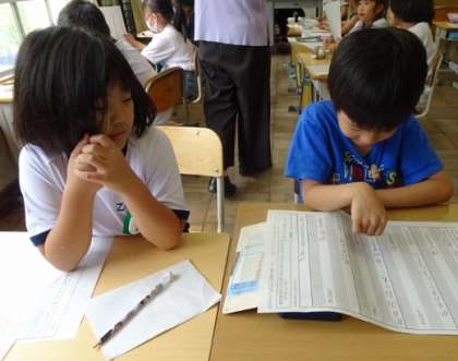 この学習は、お題の絵を知られてしまっては説明ができないので、グループ以外の子とは机を離して勉強しています。