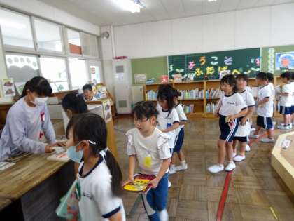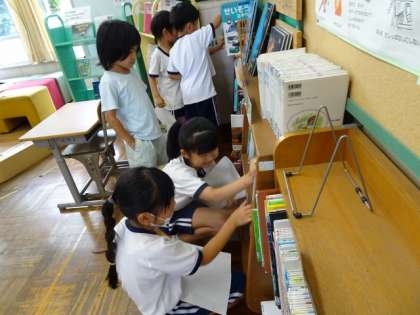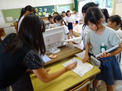今日は、低学年図書室の様子です。本を借りたらスタンプが押してもらえます。