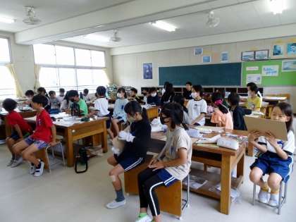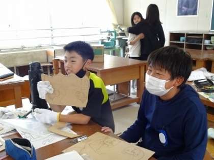 休み時間を挟んで、次の時間も図工です。けがに気を付けて電動糸のこを使ってくださいね。