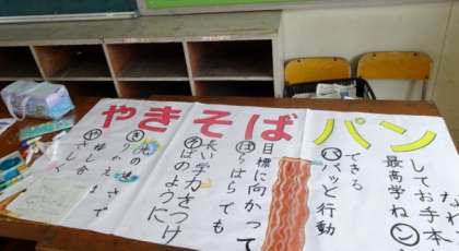 図工室で、6年生の級訓?の掲示物らしきものを見ました。友達とおしゃべりながら作業する姿が想像できました。もうすこしでできあがりかしら。