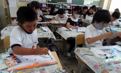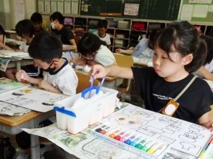4年生が、真剣に絵の具で色を塗っていました。