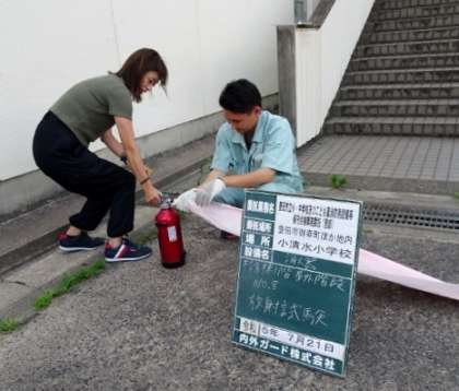 小清水っ子が休みに入ったので、休みの間に行う消防設備の点検などが始まりました。今日の点検は、1日がかりで行っていただきました。消火器の点検には先生も参加しました。消火器の中の粉も見ることができました。