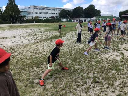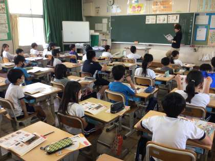 夏休みも終わり、学校生活が始まりました。気持ちを切り替えて、落ち着いて学習に取り組めています。上の写真は3組の書写の様子です。しっかりと先生の話を聞けていました。下の写真は1組の算数の授業です。長さの単元で、体を使ってグラウンドの横の長さを楽しく予想していました。