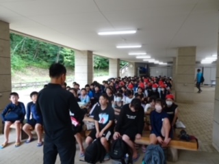 沢遊びをの準備をして、集まってきた子どもたちです。
