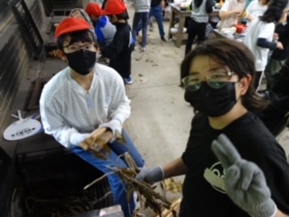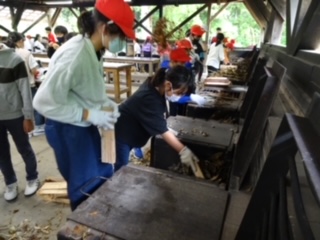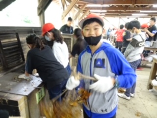 かまど係の子たちは、まきを組み始めました。見ていると、よい形にまきを組もうと工夫している子がたくさんいました。