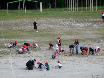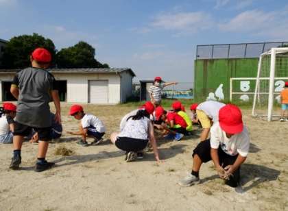 にじいろ集会のあと、3年生と4年生の1クラスが運動場の草取りをしました。