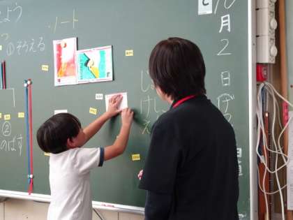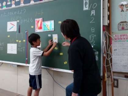 「前に出ていいですか」と断ってから、前に出てきます。そして、板書を使って話をする姿が堂々としてきた1年生です。